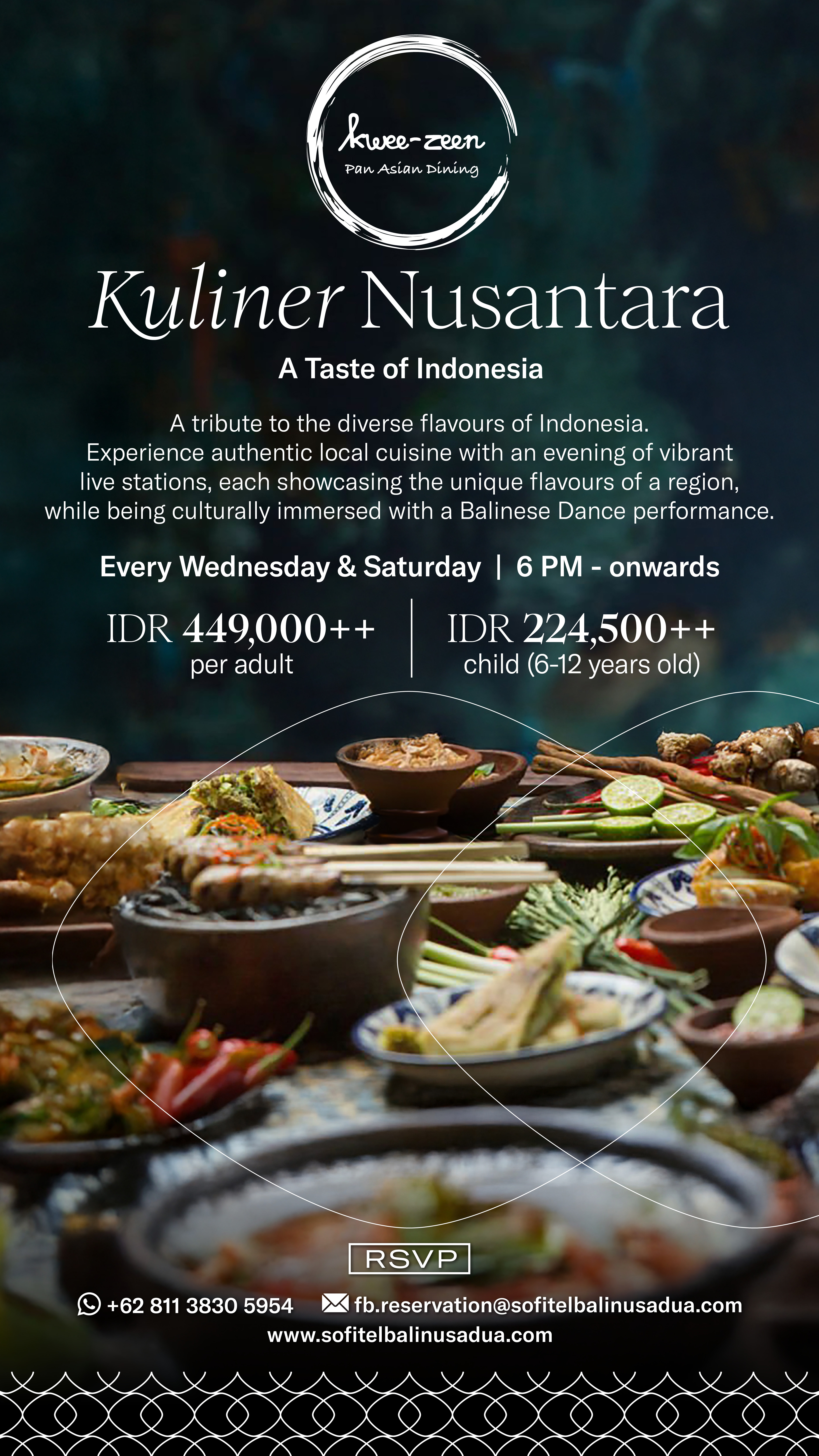 Menjelajahi kekayaan warisan kuliner Indonesia melalui santapan hidangan autentik dari berbagai penjuru nusantara. Saksikan live cooking station yang menghadirkan cita rasa khas tiap daerah, dan nikmati kemeriahan pertunjukan Tari Bali tradisional yang memukau.